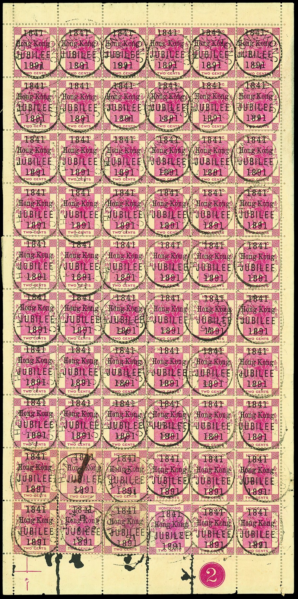 2c. carmine, a complete pane of sixty of the fourth printing, including short "U", short "J", each cancelled by Hong Kong code "E" c.d.s. dated 22 January, the day of issue. The lower two rows have suffered some insect damage and seven stamps have replacements hinged on top; the pane is still with its backing tissue. A scarce complete pane. Ex. Chan Shiu Hon. Photo