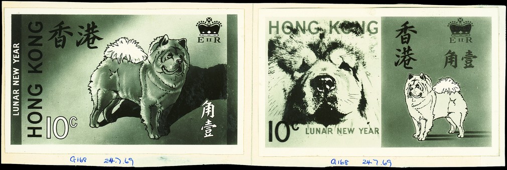 1970 Year of the Dog, 10c. photographic reproductions of essays of unissued designs, 119x67mm, showing either standing chow or full face illustration, two examples of each on pieces from the printer's archive books, the first pair dated "13.3.69" with glossy finish, the others dated "24.7.69" with matt finish. Attractive. Photo