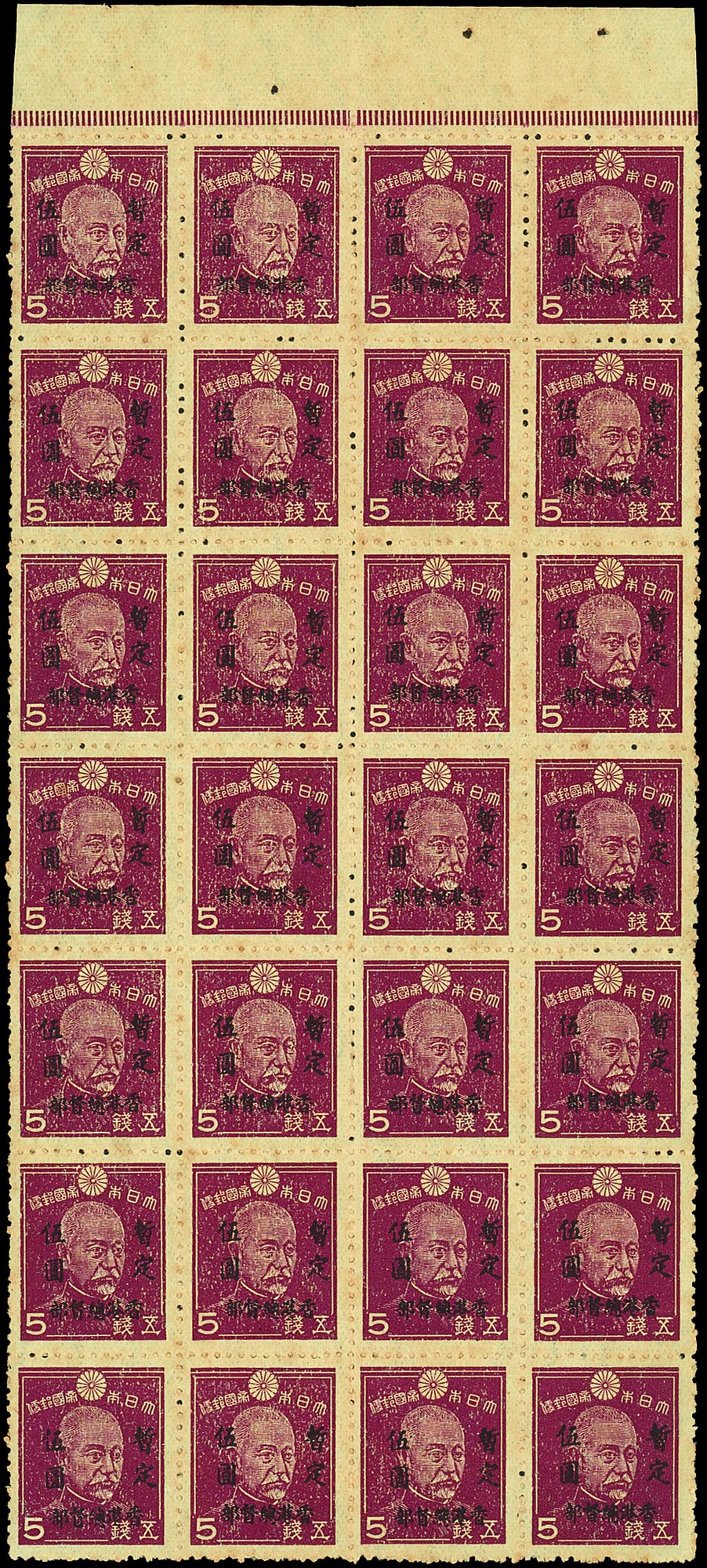 5y. on 5s. claret in a block of twenty-eight with top margin, traces of gum; some light ageing. This is one of the largest multiples of this value and an important item for the specialist. S.G. J3. Photo