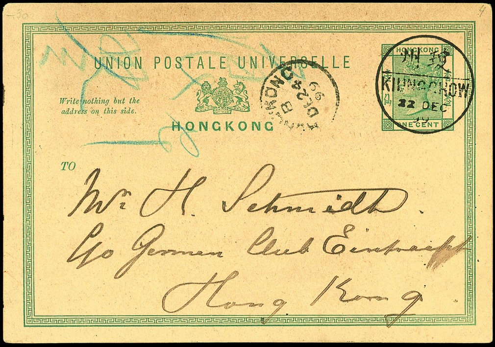 1880-95: 1899 (22 Dec.) 1c. green card addressed to Hong Kong and cancelled by a very fine strike of the Kiungchow bilingual c.d.s. with Hong Kong arrival (24.12) alongside. Stunning and irregular usage of Hong Kong stationery