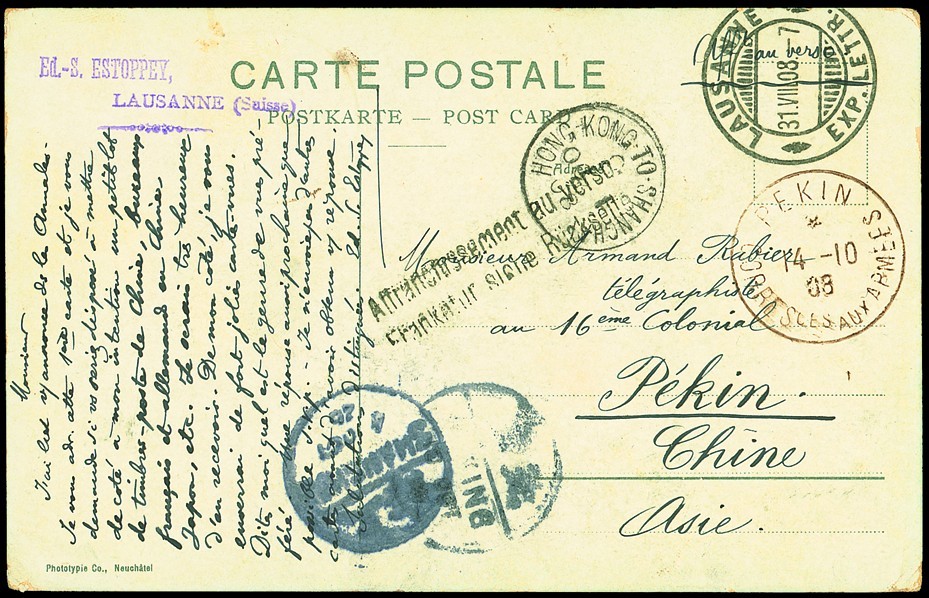 Hong Kong to Shanghai: 1908 (31 Aug.) picture post card from Lausanne to Peking, 10c. stamp on the picture side tied by the despatch c.d.s., the reverse with further despatch, a fine strike of the "hong kong to shanghai" type D c.d.s. (1.10), "pekin/corres ces aux armees" (14.10) with handstruck "Affranchissement au verso/Frankatur siche Rüchseite", also Shanghai and Peking bilingual c.d.s. Fine and attractive. Photo