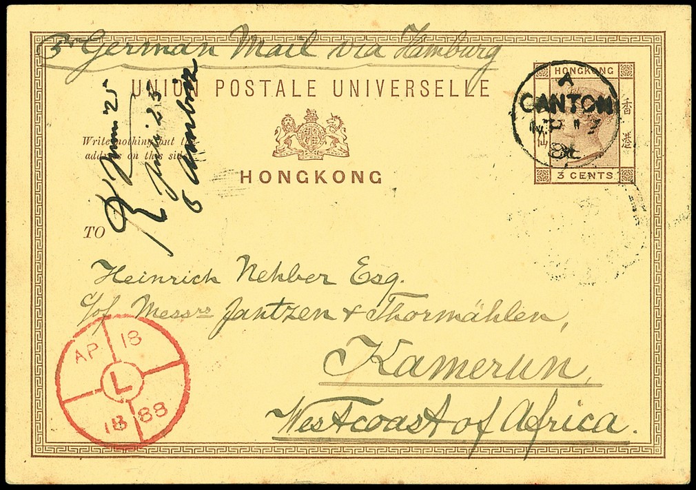 1888 (17 Mar.) Hong Kong 3c. postal stationery card to Cameroon "p German Mail via Hamburg", cancelled by straight-line, type B c.d.s. with London examiner's mark in red in lower corner (13.4); the reverse with Hong Kong and Kameroun arrival (11.6) c.d.s.; some arrival notation in upper corner does not really detract from this extraordinary cover to a very rare destination. Photo
