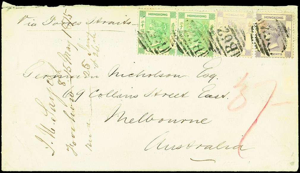 1875 (15 May) Nicholson envelope to Melbourne "Via Torres Straits" bearing 1862 18c., 1863-71 6c. lilac and 24c. pale green (2) cancelled by "B62" and with "3/-" rate mark in red crayon and bearing, on the reverse, despatch and Hong Kong (19.5) c.d.s. in blue with Melbourne arrival (25.7); usual notation on front. A good triple rate franking. Photo
