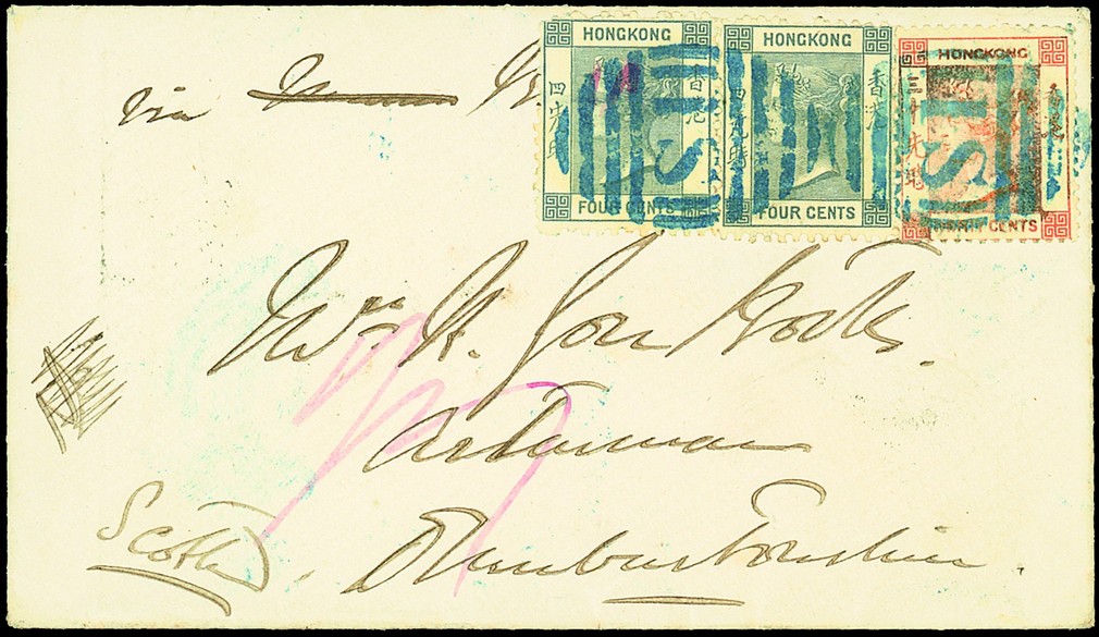 1871 (13 Jan.) envelope to Dunbartonshire, Scotland bearing 1863-71 4c. bluish slate perf.12½ (2) and 30c. vermilion just tied by good strikes of the second type "S1" in blue, the reverse with despatch c.d.s. in blue, Hong Kong (23.1) and Helensburgh (6.3) c.d.s.; the left 4c. has an irregular perf. in the upper left corner, probably the result of a broken perf. pin which can be seen in the lower left corner. The routing has been obscured by the adhesives but this 38c. rates should be by Brindisi due to the Franco-Prussian War; just before the rate was reduced on 16th January. An extraordinary and remarkable franking, of nine covers bearing the perf.12½ stamp, this is one of only two bearing two examples. R.P.S. Certificate (1997). Photo