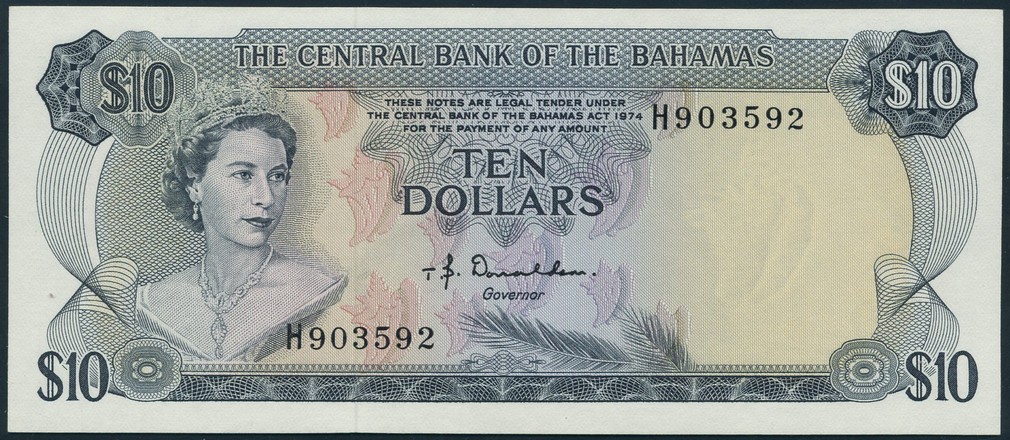 (x) Central Bank of the Bahamas, $10, ND (1974), serial number H 903592, dark grey, lilac and pale yellow, Elizabeth II at left, value at centre and at each corner, Donaldson signature at centre, reverse multicoloured, flamingoes