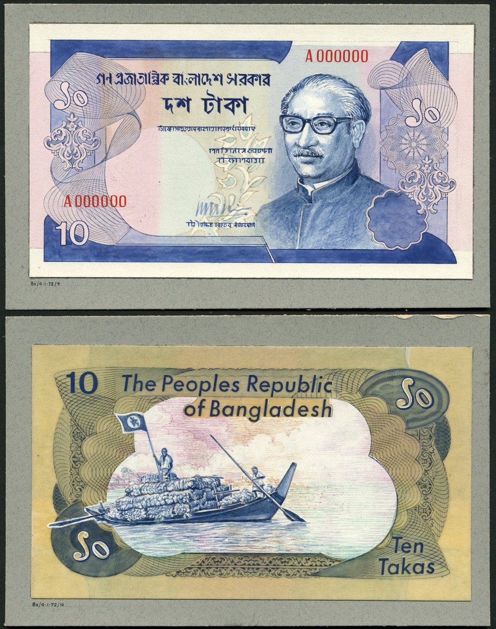 (†) The People's Republic of Bangladesh, an obverse and reverse composite essay on board for a 10 Takas, ND (1972), serial number A 0000000, signature at lower centre, blue on multicoloured underprint, portrait of Mujibur Rahman at right, geometric design at left and right, reverse blue, olive-green and multicoloured, vignette of a canoe laden with goods at left with one man paddling and another man waving a flag, value in each corner