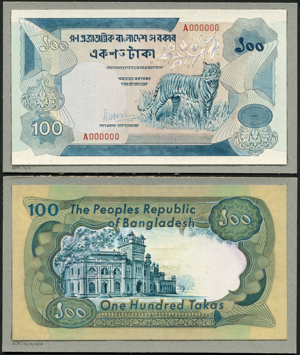 (†) The People's Republic of Bangladesh, an obverse and reverse composite essay on board for a 100 Takas, an obverse and reverse composite essay on board for a 100 Takas, ND (1972), serial number A 0000000, signature at lower centre left, blue and pale grey on pink underprint, tiger at centre right, value in three corners, geometric design at left and right, reverse sage-green, yellow ochre and blue, of Mujibur Rahman at right, flag at centre, reverse brown and olive-green, vignette of a building with turreted tower at centre left, value in three corners