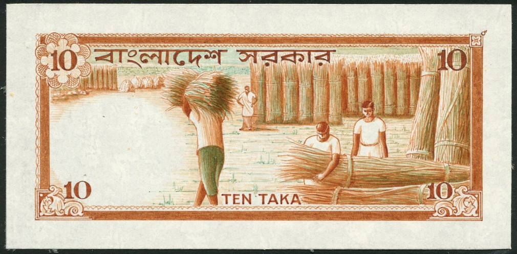 (†) Bangladesh Bank, a reverse composite essay on card for a 10 Taka, ND (c.1972), brown, green and multicoloured, workers carrying sheaves, value in each corner