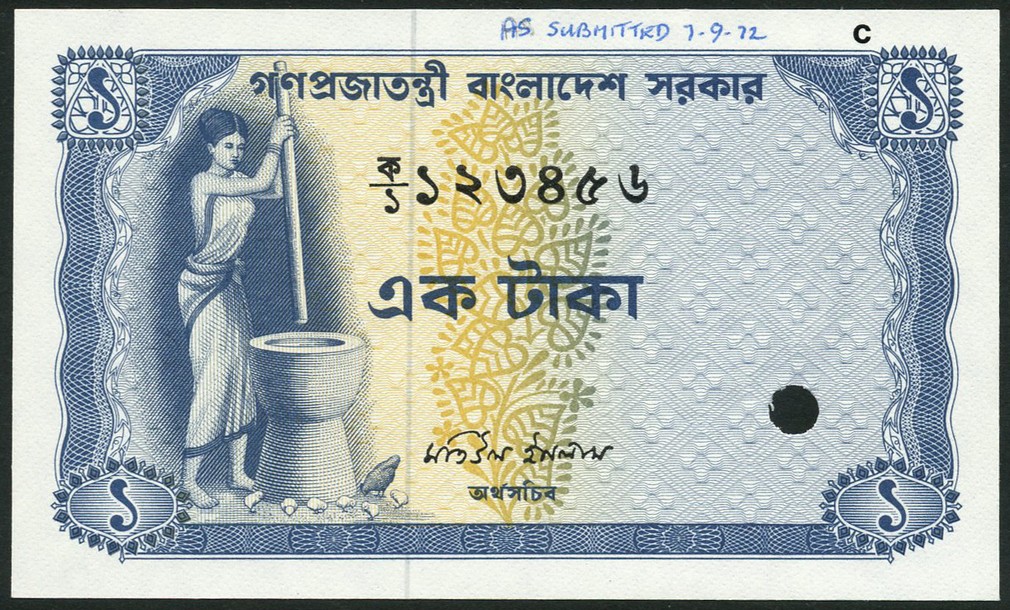 (†) Bangladesh Bank, colour trial 1 taka (3), ND (1973), one purple, one violet and one blue, woman with pestle at left