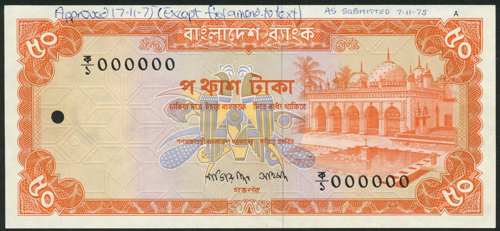 (†) Bangladesh Bank, colour trial 50 taka, ND (1975), zero serial numbers, orange and multicoloured, three colour varieties in central guilloche, Sat Gamnbuj Mosque in Dhaka at right, reverse orange, tea harvesting