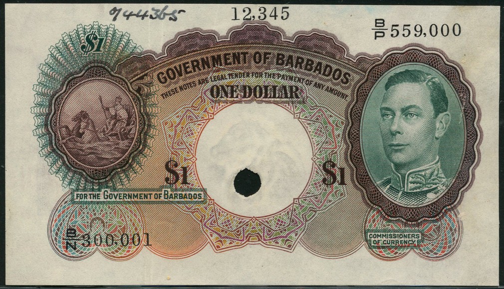 (x) Government of Barbados, specimen $1, ND (1939), serial number B/N 300001-B/P 559000, purple and multicoloured, George VI at right, biga of Hippocamps at left, also Bahamas specimen $1, law of 1968, green, Elizabeth II at left