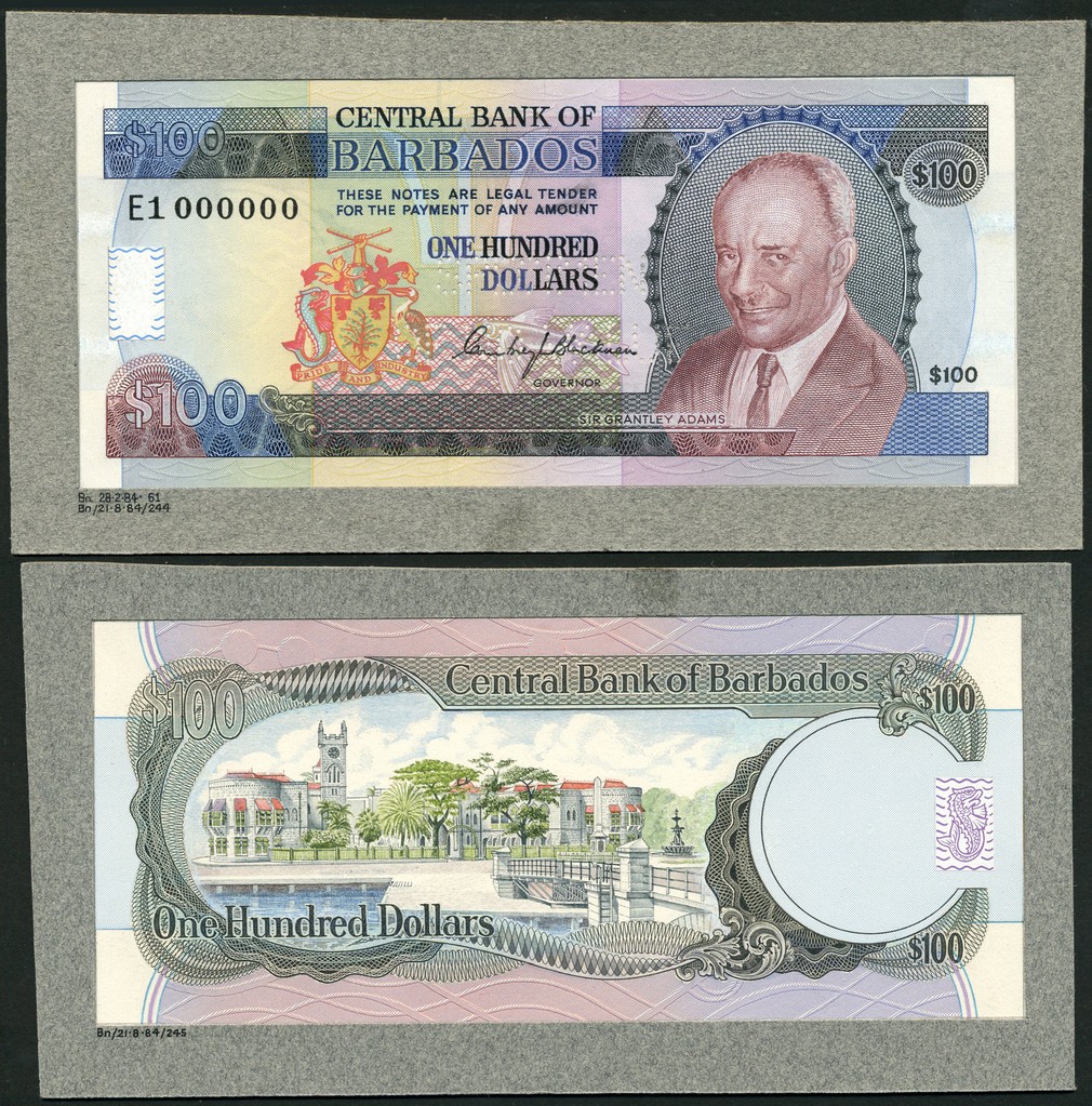 (†) Central Bank of Barbados, an obverse and reverse composite essay for a $100, ND (1984), serial number E1 000000, multicoloured, Sir Grantley Adams at right, reverse, Trafalgar Square