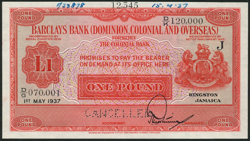 (†) Barclays Bank (Dominion, Colonial and Overseas), Jamaica, specimen £1, Kingston, 1 May 1937, serial number D/G 070001-D/K 120000, red, pale green and lilac, arms and J at right, value at left, reverse red and grey-green, arms at centre, value at left and right