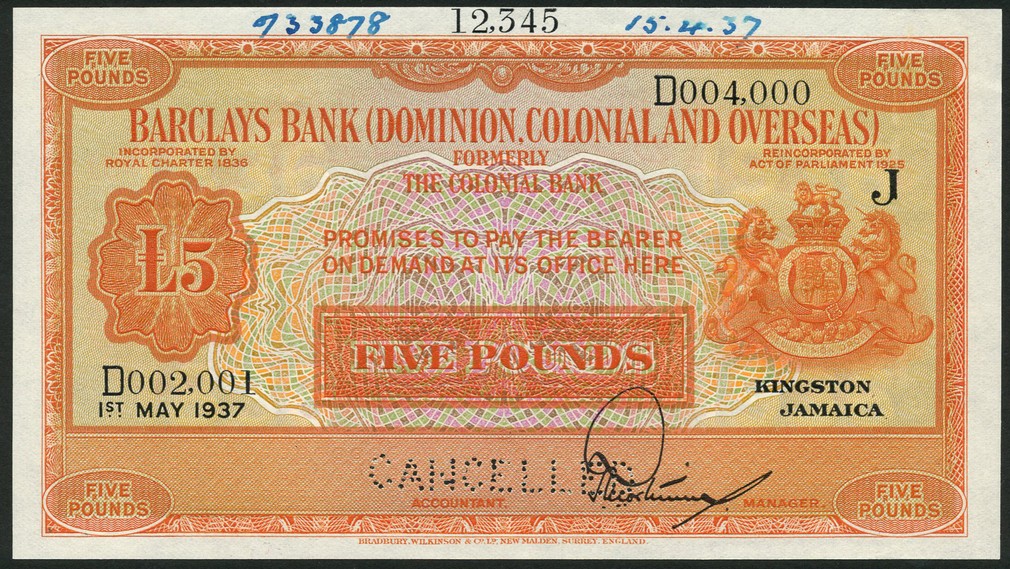 (†) Barclays Bank (Dominion, Colonial and Overseas), Jamaica, specimen £5, Kingston, 1 May 1937, serial number D 002,001-D004,000, orange, pale green and lilac, arms and J at right, value at left, reverse orange and very pale brown, arms at centre, value at left and right