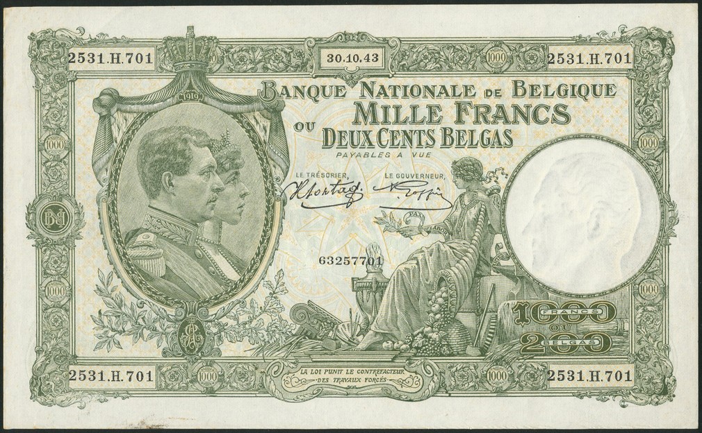 Banque National de Belgique, 1000 francs or 200 belgas (9), 30 October 1943, serial number 2531.H.701-709, green on multicolour underprint, King Albert and Queen Elisabeth at left