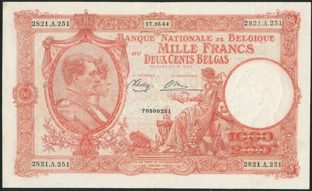 Banque Nationale de Belgique, 1000 francs/200 Belgas, 17 October 1944, serial number 2821.A.251, red, pale blue and pink, King Albert and Queen Elisabeth at left, maiden with cornucopia at right (Abundance), reverse red, woman with embroidery at right