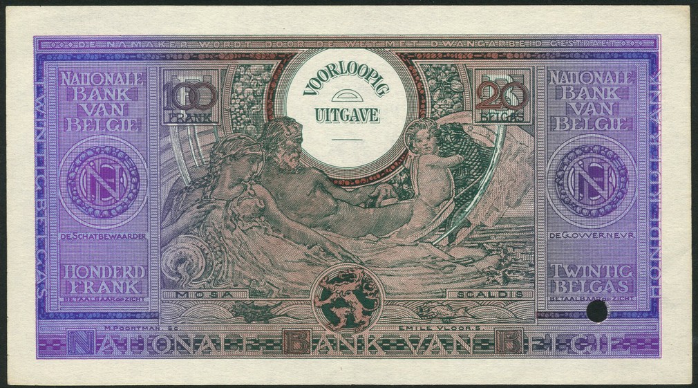 (†) Banque Nationale de Belgique, printers archival trial/proof 100 francs/20 belgas, ND (1943), one blue, one purple and one olive and red-brown, Elisabeth at left, Albert at right, maiden at centre, EMISSION PROVISOIRE at top centre, reverse sea God, nymph and cherub
