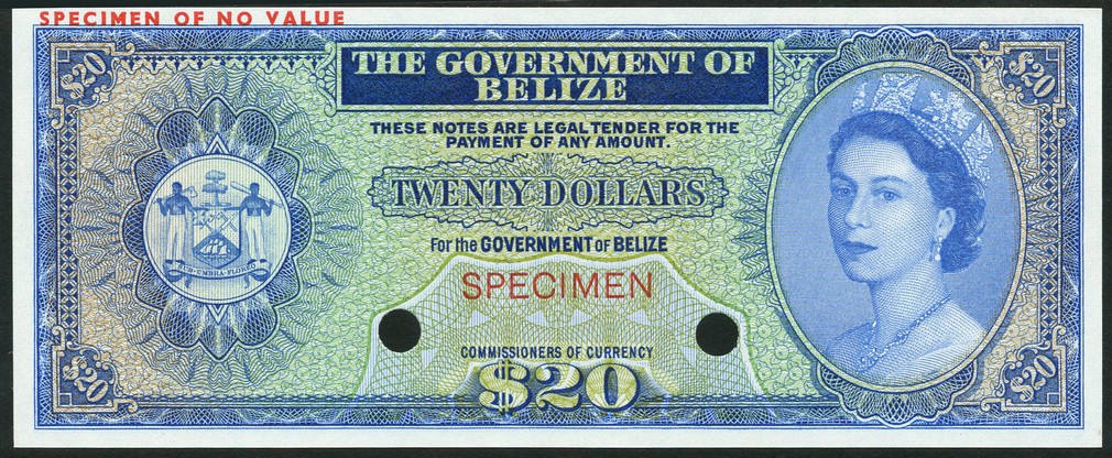 (†) Government of Belize, a colour trial set of the ND (1974-1975) series comprising $1, blue, $2, brown, $5, red, $10, green, $20, blue, all Elizabeth II at right, arms at left