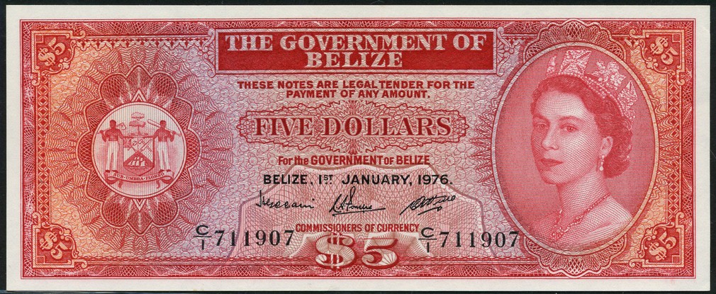 (x) Government of Belize, $5, 1 January 1976, prefix C/1, red, Elizabeth II at right, arms at left