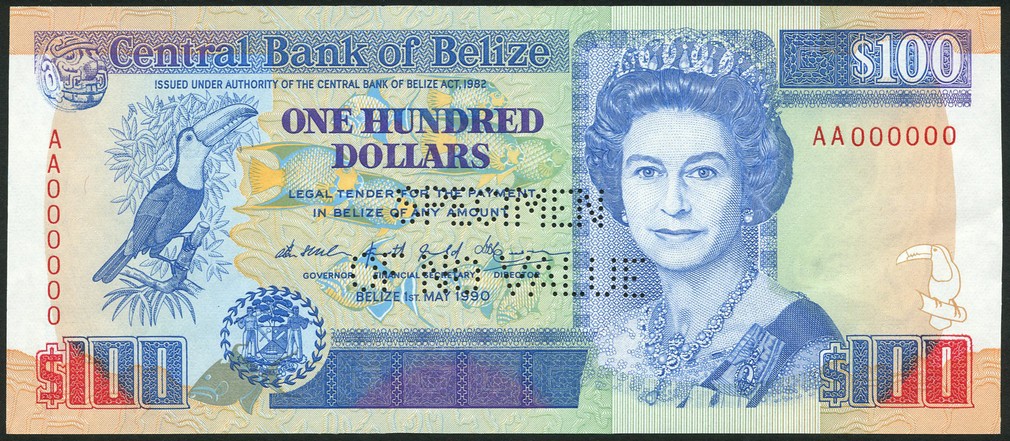 Central Bank of Belize, specimen $100, 1 May 1990, serial number AA000000, blue on multicolour underprint, Elizabeth II at right, toucan at left, arms at low left, reverse birds and animals of Belize