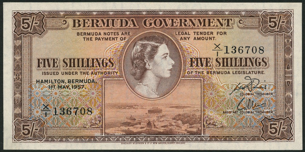 (x) Government of Bermuda, 10 shillings (2), 1 May 1957, consecutive serial numbers X/1 136707/8, brown on multicolour underprint, Queen Elizabeth II at centre, Hamilton harbour low centre, value left and right and at each corner, reverse, brown green and violet, arms at centre, value at left and right
