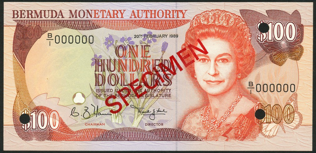 (x) Bermuda Monetary Authority, partial specimen set of the 1988-89 issue comprising, $2, ND (1988), $10, $20, $50, $100, all 20 February 1989 and all serial number B/1 000000, Queen Elizabeth II at right, various Bermudan scenes on reverses, hole punched