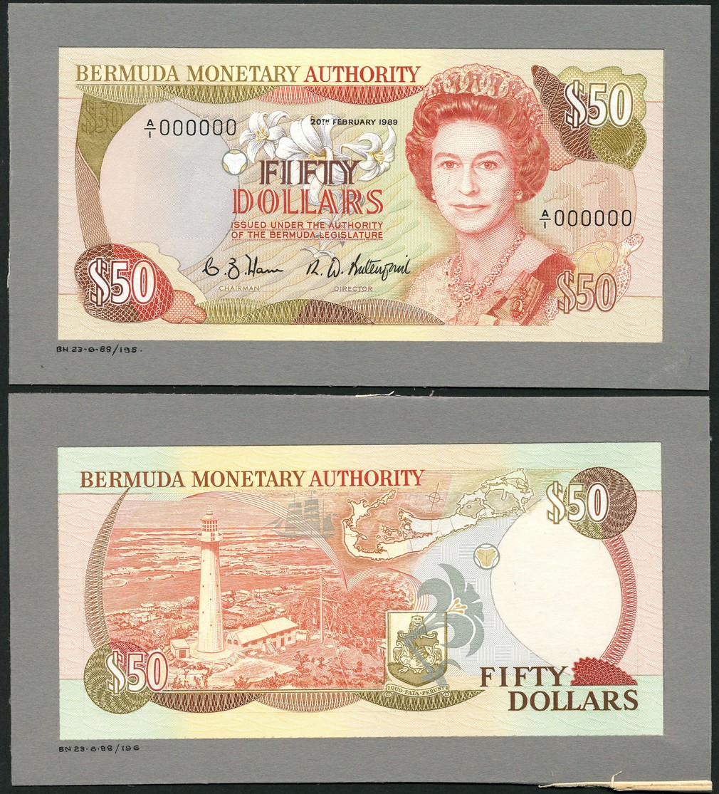 (†) Bermuda Monetary Authority, an obverse and reverse composite essay for a $50, 20 February 1989, serial number A/1 000000, red and multicoloured, Queen Elizabeth II at right, Mann and Butterfield signatures, reverse, lighthouse and arms