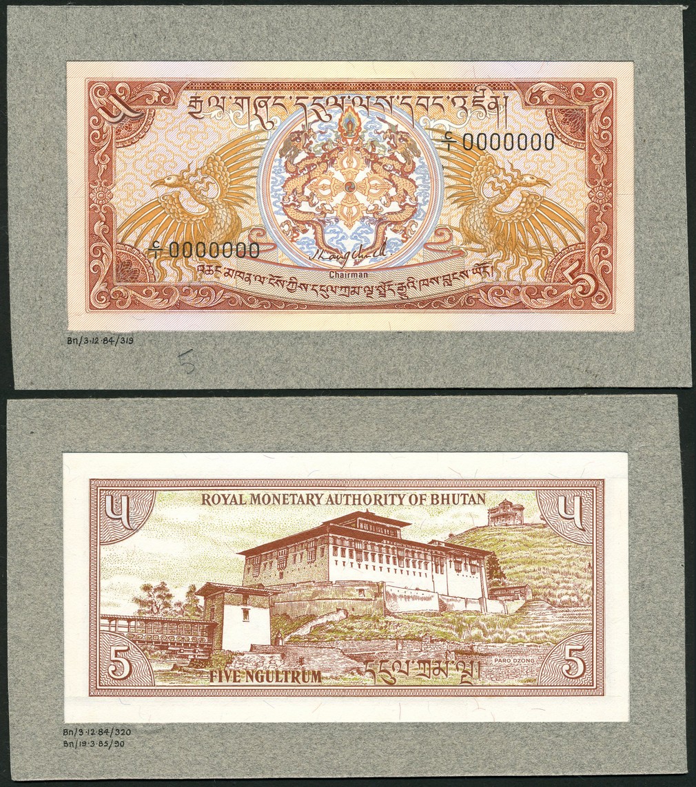 (†) Royal Monetary Authority of Bhutan, an obverse and reverse composite essay on card for a 5 Ngultrum, ND (c.1984), serial number C/1 0000000, brown and multicoloured, royal emblem between birds at centre, value at upper left and lower right, reverse Paro Dzong palace at centre, value in each corner