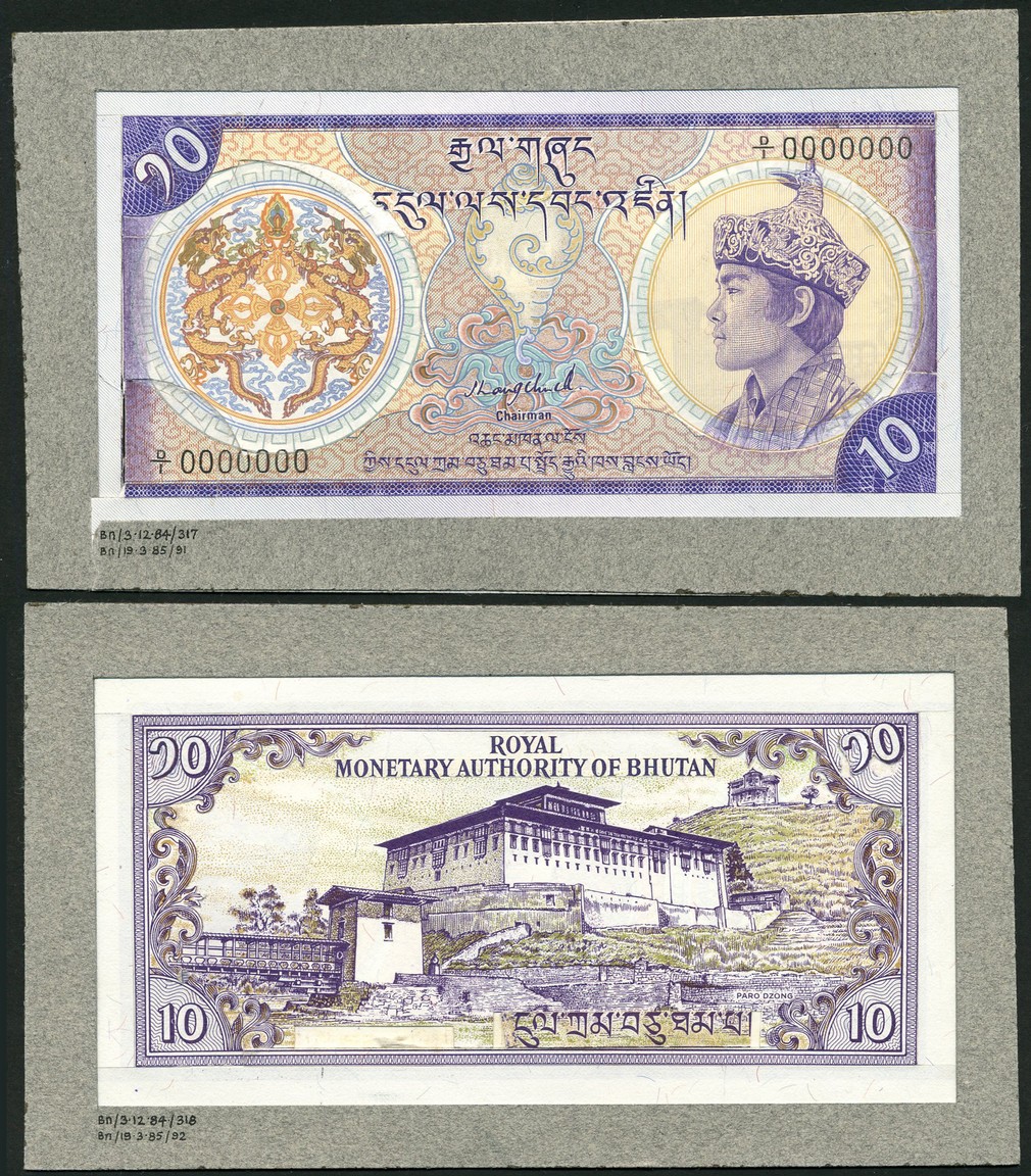 (†) Royal Monetary Authority of Bhutan, an obverse and reverse composite essay on card for a 10 Ngultrum, ND (c.1984), serial number D/1 0000000, violet and multicoloured, royal emblem at left, portrait of J. Singye Wangchuk at right, value at upper left and lower right, reverse Paro Dzong palace at centre, value in each corner