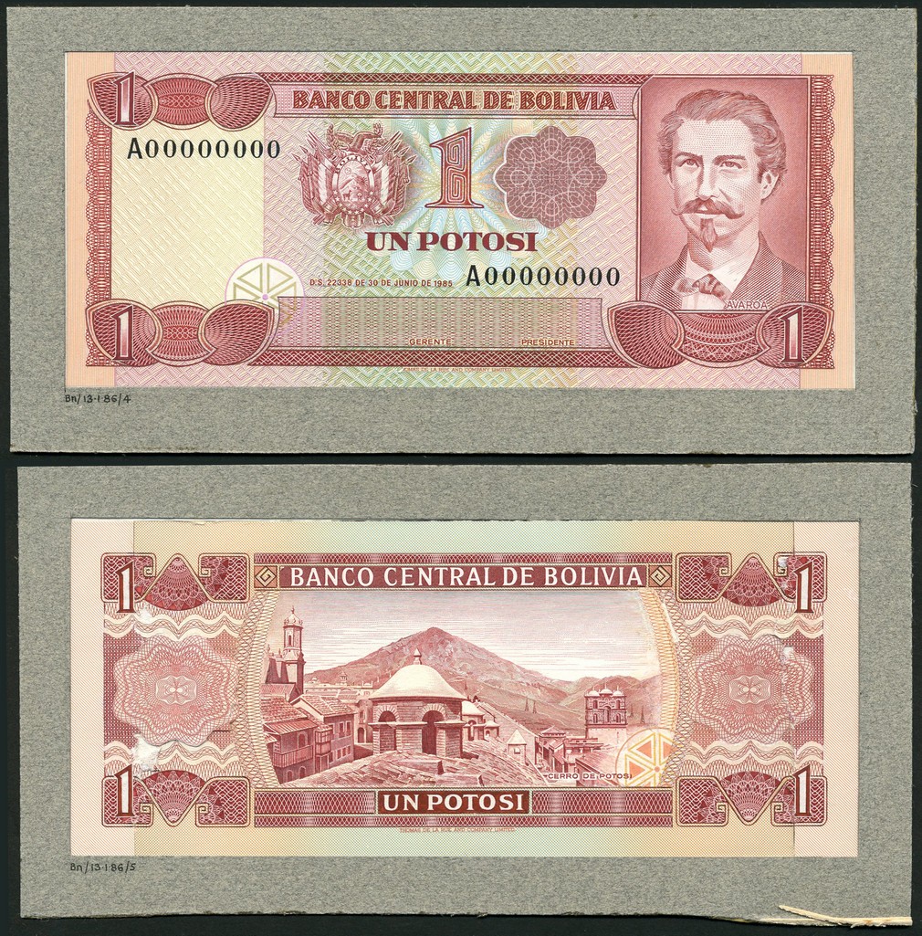 (†) Banco Central de Bolivia, an obverse and reverse composite essay for a 1 potosi, decree of 1985, serial number A00000000, purple and multicoloured, Avaroa at right, arms left centre, reverse, purple, Cerro de Potosi at centre