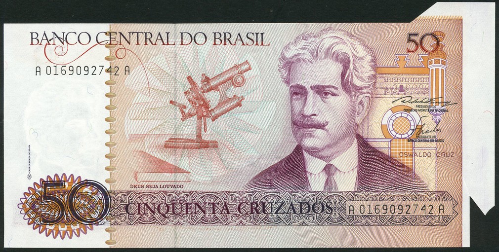 ERROR: Banco Central do Brasil, 50 Cruzados, ND (1986), serial number A0169027 42 A and A0033000472 A, purple on muticolour underprint, Oswaldo Cruz at right, microscope at centre, reverse Cruz Insitute at centre,