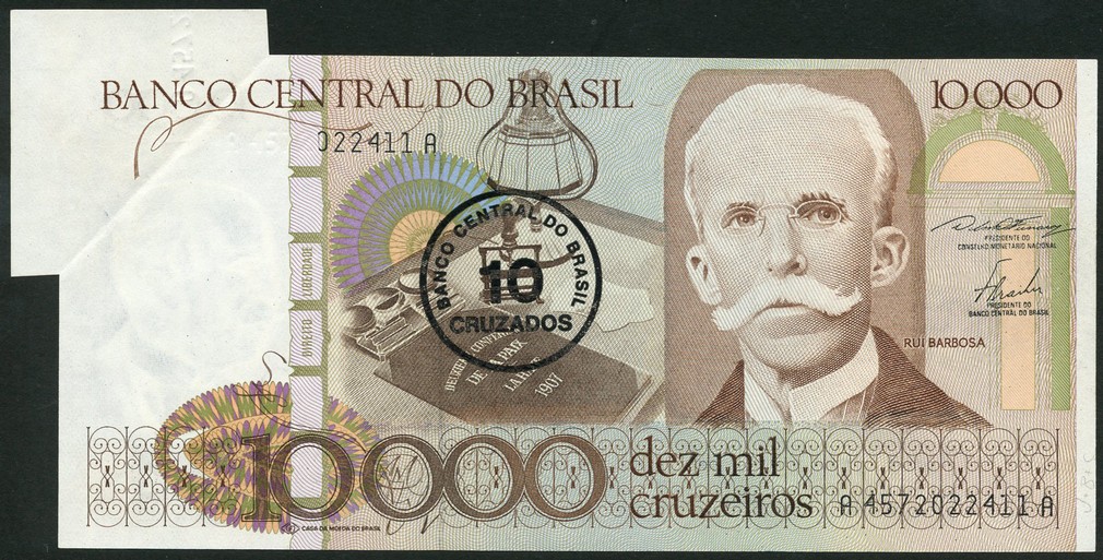 ERROR: Banco Central do Brasil, 10,000 Cruzeiros, ND (1986), serial numbers A4572022411A and A4275019937A, brown on multicolour underprint, black circular overprint with new currency unit on at centre, extra paper with part of serial number on reverse, the second note normal