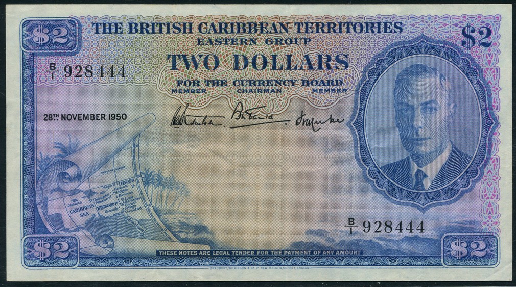 (x) British Caribbean Territories, $2, 28 November 1950, prefix B/1, blue and multicoloured, George VI at right, map at left