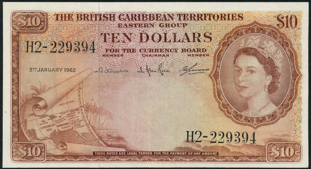 British Caribbean Territories, $10, 2 January 1962, serial number H2-229394, brown and multicoloured, Elizabeth II at right, map at left, D'Andrade, Reece and Burrowes, reverse brown, arms
