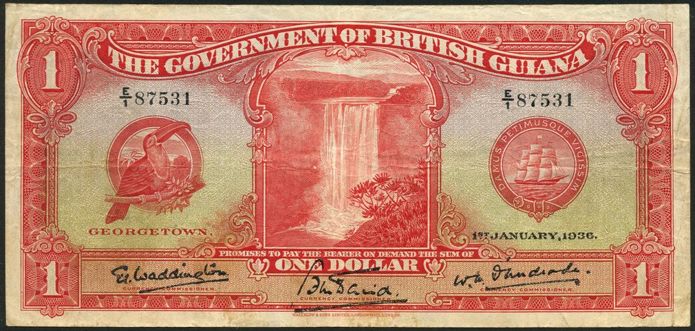 Government of British Guiana, $1, 1 January 1936, serial number E/1 87531, red and pale green, Kaiteur Falls at centre, toucan at left, ship seal at right, reverse red, George V at centre, value at left and right