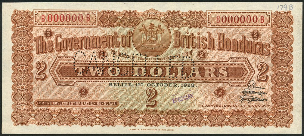 (x) Government of British Honduras, specimen $2, Belize, 1 October 1928, red serial number B 000000 B, brown, pale pink-brown and pale green, arms top centre, value in brown tablet at centre, value in field, three printed signatures low right, floral background in field, reverse brown, engine turnings