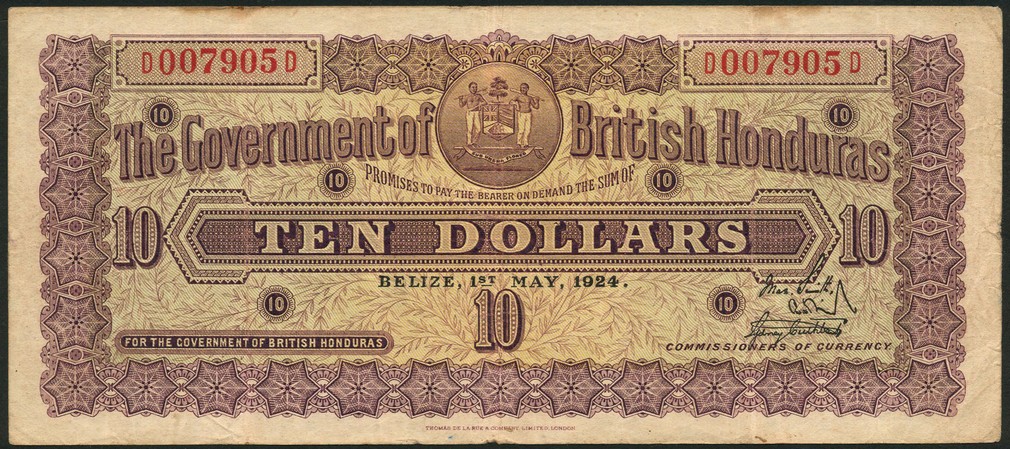 (x) Government of British Honduras, $10, Belize, 1 May 1924, red serial number D 007905 D, violet and pale yellow, arms top centre, value in violet tablet at centre, value in field, three printed signatures low right, floral background in field, reverse violet, engine turnings