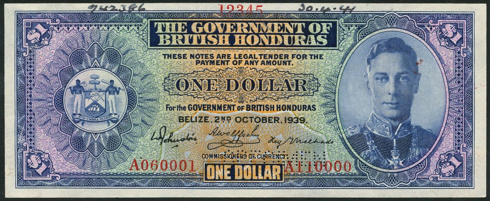 (†) Government of British Honduras, specimen $1, Belize, 2 October 1939, red serial number A0600001-A110000, blue and multicolour, arms at left, George VI at right