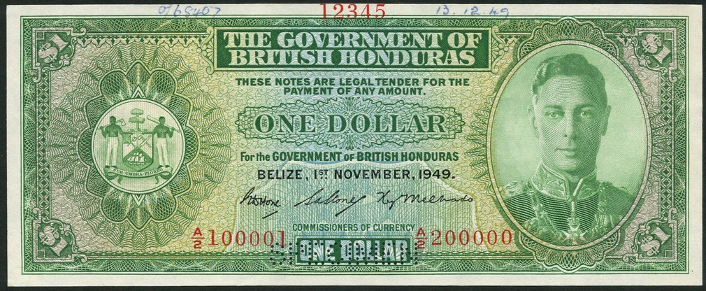 (†) Government of British Honduras, specimen $1, green and multicoloured, and $2, violet and multicoloured, both Belize, 1 November 1949, red prefixes A/2 and B/2 respectively, both arms at left, George VI at right