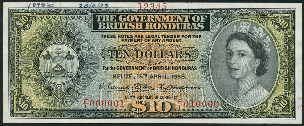 (†) Government of British Honduras, specimen $10, Belize, 15 April 1953, red serial number F/1000001-F/1010000, black, green and orange, arms at left, Elizabeth II at right