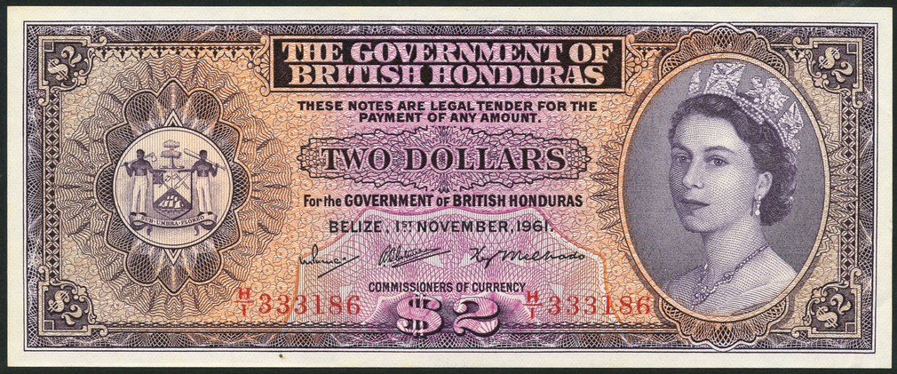 (x) Government of British Honduras, $1, 1 March 1956, red serial number G/3263054, and $2, 1 November 1961, red serial number H/1333186, green on multicolour underprint and violet on multicolour underprint respectively, both Queen Elizabeth II at right, arms at left, reverse, ornate pattern