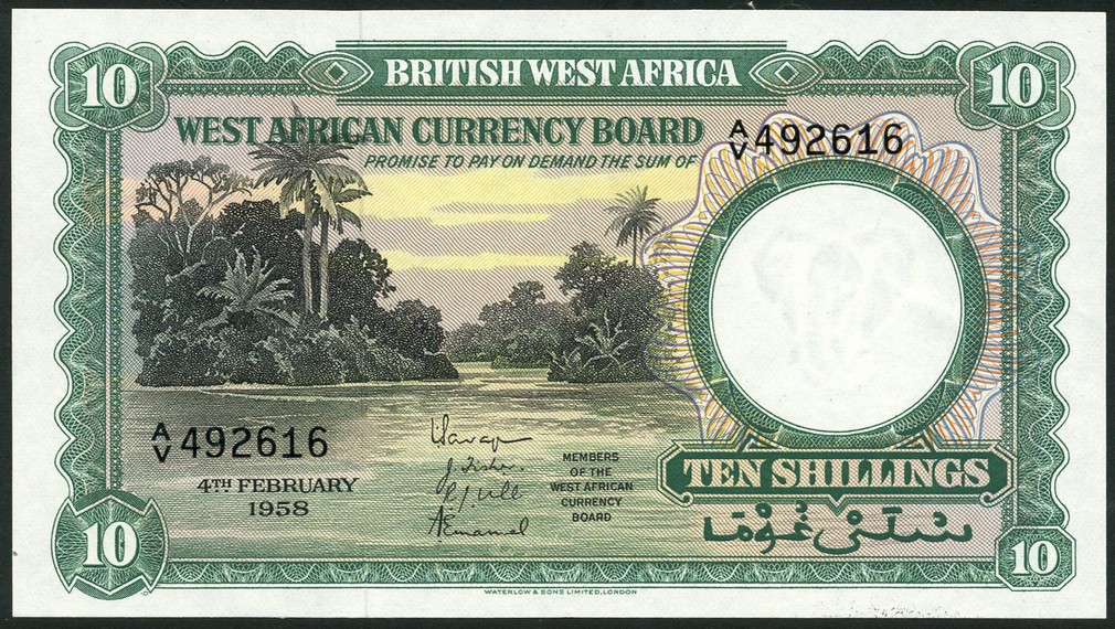 (†) British West African Currency Board, 10 Shillings, 4 February 1958, serial number A/V 492616, black and green, river scene with palm trees at left, reverse field workers