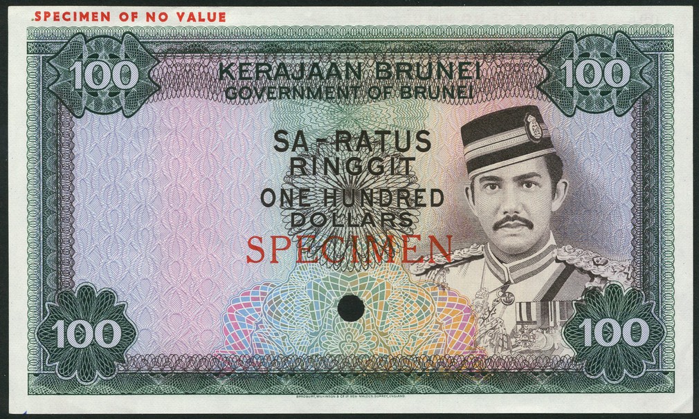 (†) Government of Brunei, specimen colour trial 50 Ringgit, ND (1972/1973), violet on multicoloured underprint, Sultan Hassanal Bolkiah I at right, reverse the Omar Ali Saifuddin Mosque, also a specimen colour trial 100 ringgit, dark green and multicoloured, Sultan Hassanal Bolkiah I at right, reverse Mosque,