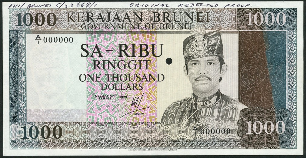 (†) Government of Brunei, specimen proof for a 1000 Ringgit, 1979, serial number A/1 000000, grey, brown and greenish-blue, Sultan Hassani Bolkiah I at right, reverse Brunei Museum, one punch hole, also a proof 500 ringgit with registration marks and dated 1979, serial number A/1 120001, orange and multicoloured, reverse orange-brown, Mosque at centre