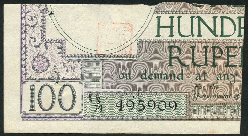 Burma, Government of India, a quarter 100 rupee, type of 1937, Burma issue, serial number 8/74 495909, lilac and green, low left hand quarter of the full note, red chop mark at centre, reverse lilac and green, black overstamped serial number H/R12131,