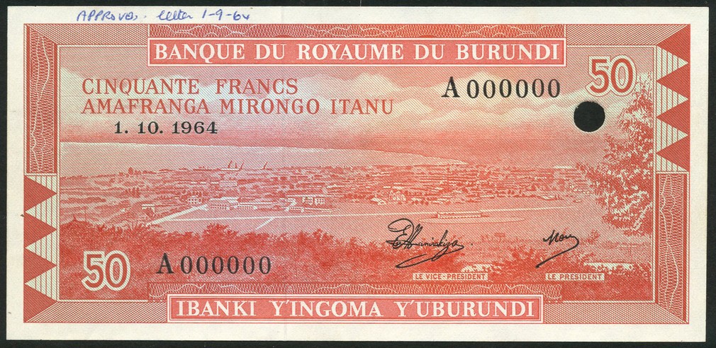 (†) Banque du Royaume du Burundi, specimen 50 francs, 1 October 1964, serial number A000000, red, view of Bujumbura at centre, reverse arms, single cancellation hole