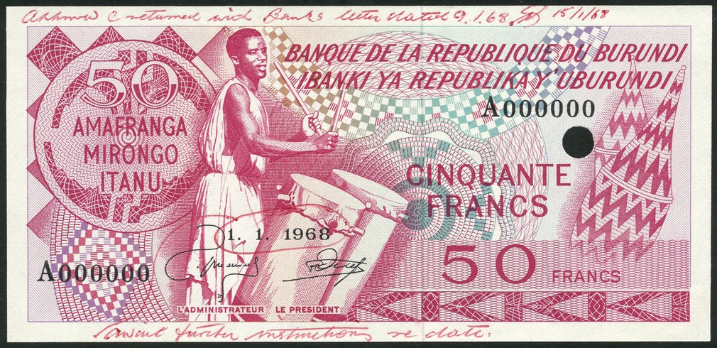 (†) Banque de la Republique du Burundi, specimen 50 francs, 1 January 1968, serial number A000000, red on multicolour underprint, drummer at centre left, single cancellation hole