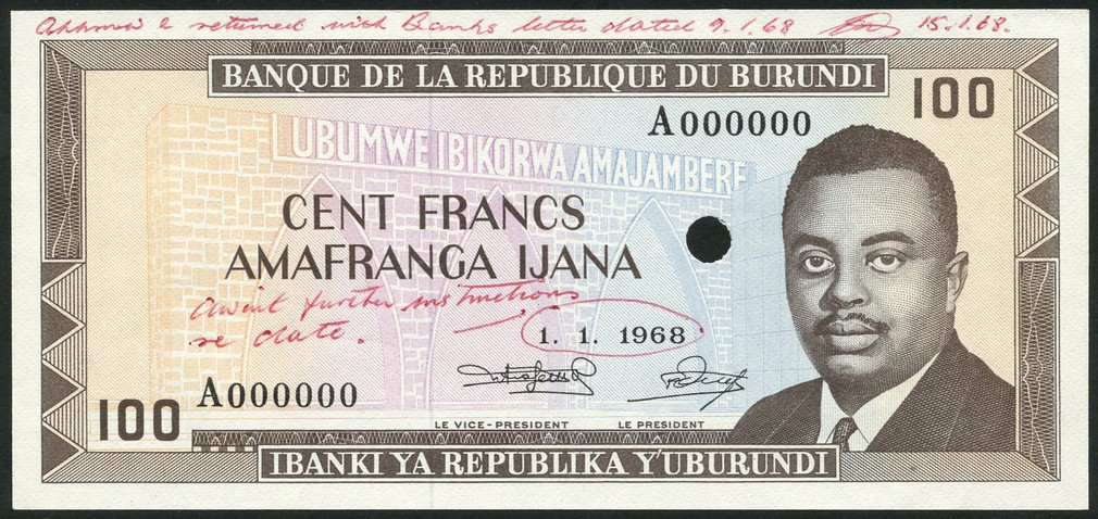 (†) Banque de la Republique du Burundi, specimen 100 francs, 1 January 1968, serial number A000000, red on multicolour underprint, Prince Rwagasore at right, single cancellation hole