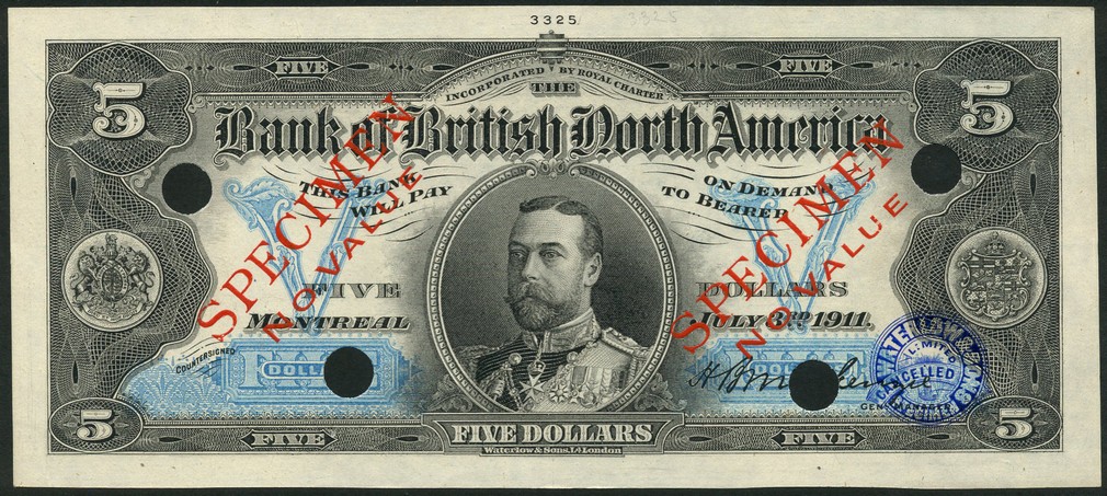 (x) Bank of British North America, Canada, specimen $5, Montreal, 3 July 1911, black and white, value in blue at left and right, arms at left and right, George V at centre, reverse blue, arms and value