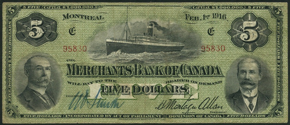(x) Merchants Bank of Canada, $5, 1 February 1916, serial number 95830, black and green, steam liner at centre, D.C.Macrow at low left, H.Montagu Allan at low right, value at low centre and top corners